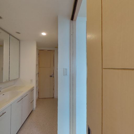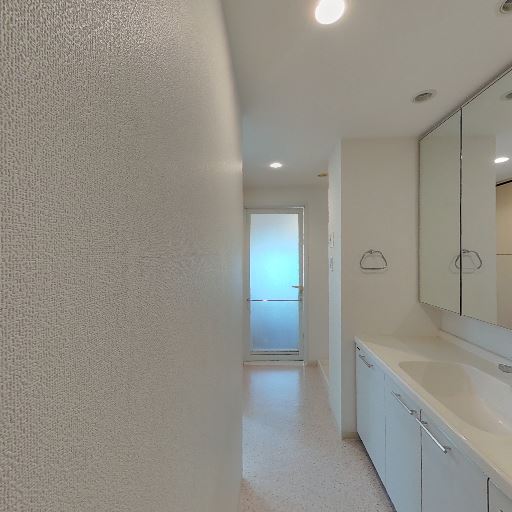 • 洗面スペースが広く明るい(確度88%):洗面台前の通路にある程度の奥行きがあり、白基調の内装とダウンライト、奥の扉からの光で空間が明るく見える。