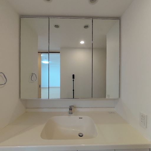 • 三面鏡付きの洗面台で収納性が高そう(確度92%):front画像中央に三面鏡タイプの洗面化粧台があり、鏡裏収納を備えている可能性が高い。洗面まわりの小物を隠して整理しやすい構成に見える。