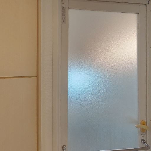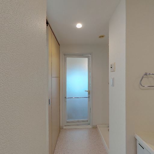 • 自然光を取り込みやすい開口部がある(確度81%):すりガラスの扉と足元側の窓が確認でき、洗面脱衣所に外光が入る可能性が高い。