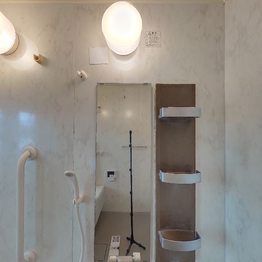 • 浴室内は全体的に明るく清潔感がある(確度87%):白系の壁面と照明により、浴室全体が明るく見え、圧迫感が少ない。