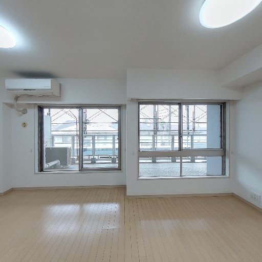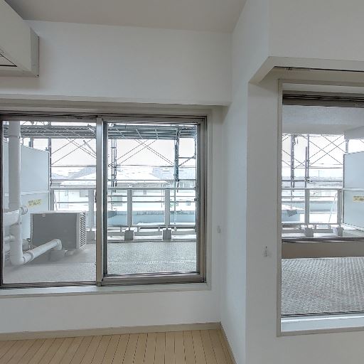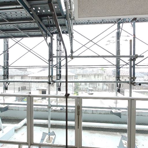 • 室内への採光は見込めるが、足場で抜け感は弱い(確度93%):開口部が大きく室内に光は入りそうだが、バルコニー前面に工事用の足場が組まれており、眺望や開放感はかなり阻害されている。