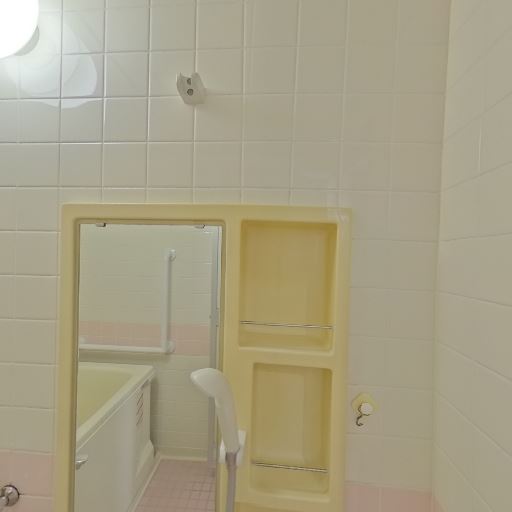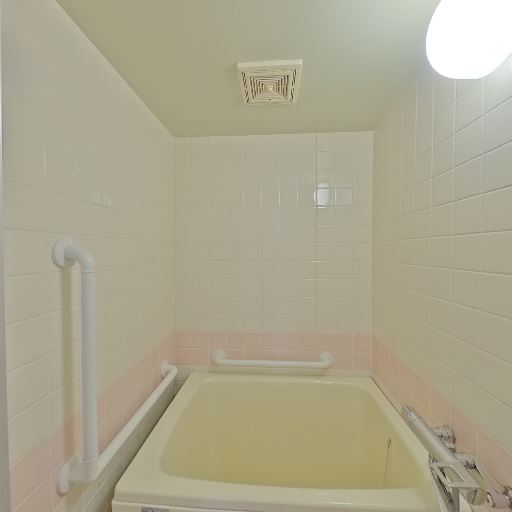• 浴室はレトロなタイル仕上げで手すり付き(確度86%):壁と床はタイル張りで、浴槽周りと壁に複数の手すりが設置されている。段差のある在来浴室と思われる。