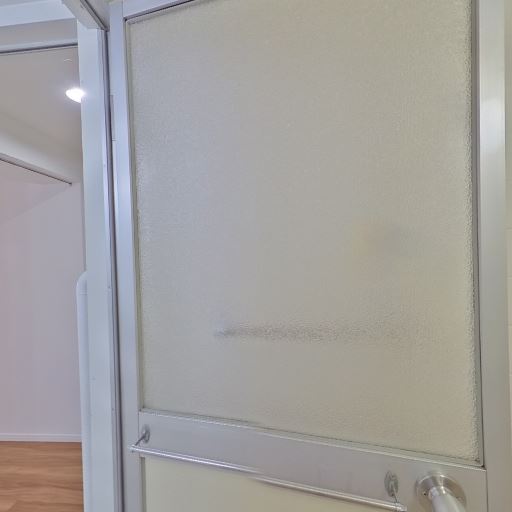 • 浴室出入口はすりガラス引き戸(確度70%):室内側に不透明ガラスの引き戸があり、脱衣所との仕切りになっている。
