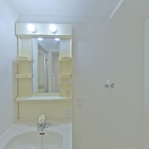• 独立洗面台と収納棚(確度86%):鏡付きの独立洗面台があり、左右に小物棚とコンセントが見える。上部照明も2灯で明るい。
