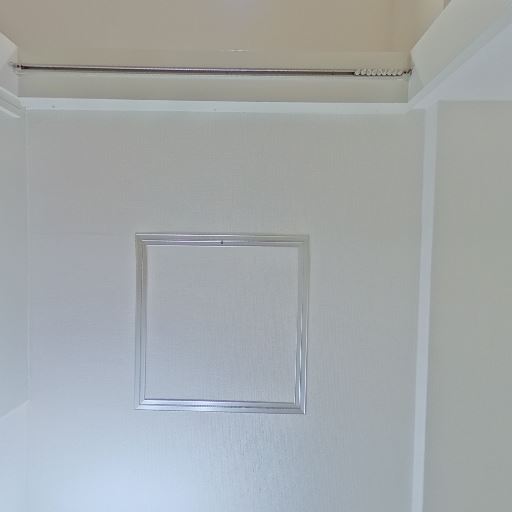 • 天井・壁の状態(確度72%):天井・壁は白色で大きな汚れやカビは見当たらない。点検口と物干しポールのようなバーがある。