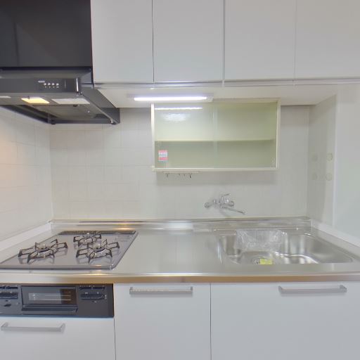 • キッチンの設備感(確度88%):ワイドシンクと3口ガスコンロ、吊り戸棚付きで作業スペースも広い。