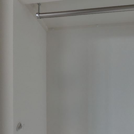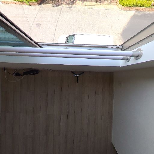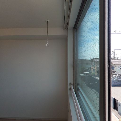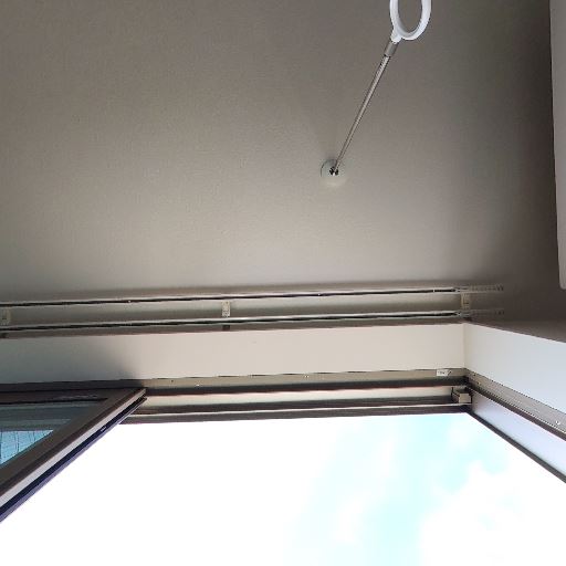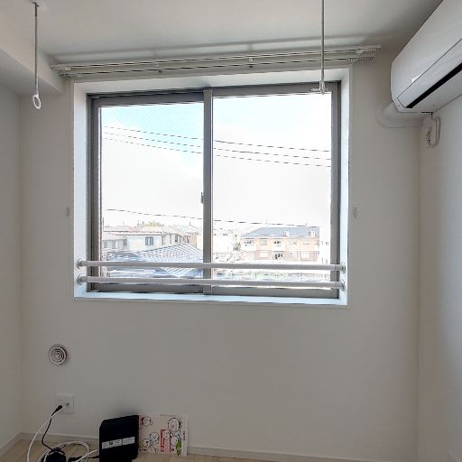 室内物干しが設置されている(確度95%):窓際上部から室内物干し用と思われるポールが見え、洗濯物を部屋干ししやすい設備がある。