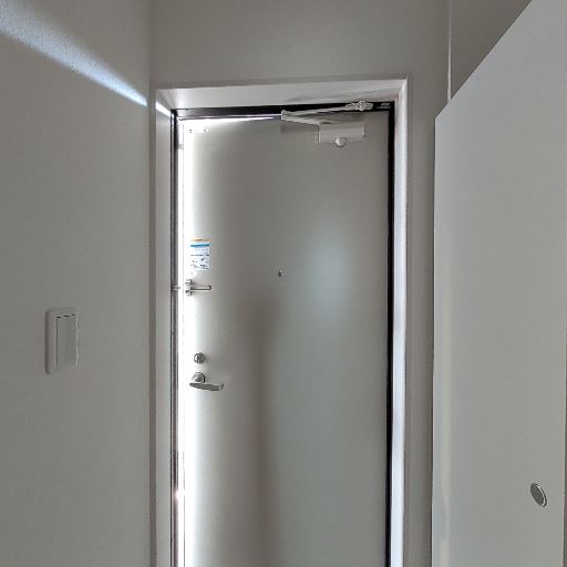 玄関扉まわりから外光が入りやすい(確度77%):玄関ドアの縁から強い光が入っており、共用廊下側の明るさはある一方で、気密性や遮光性はやや気になる見え方になっている。
