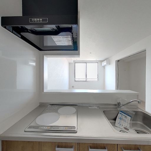 対面キッチンで開放感がある(確度93%):キッチン前方が壁で閉じず開口になっており、隣接空間や窓方向へ視線が抜ける対面型のレイアウトに見える。
