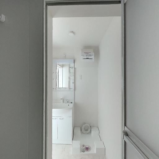 洗濯機置場が室内に確保されている(確度96%):床面に洗濯機パンと給排水設備が見え、脱衣・洗面スペース内に室内洗濯機置場が設けられていると判断できる。
