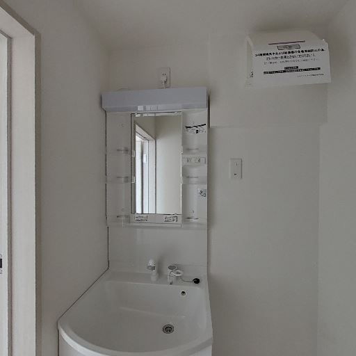 独立洗面台があり身支度しやすい(確度94%):洗面ボウルと三面鏡付きの独立洗面台が設置されており、洗面・整髪・収納を一か所で行いやすい構成に見える。