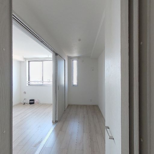 主室へつながる開放的な動線(確度87%):収納スペースから引き戸越しに居室が見えており、閉塞感が少ない構成になっている。奥には窓も確認できる。