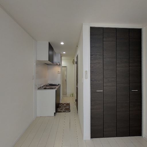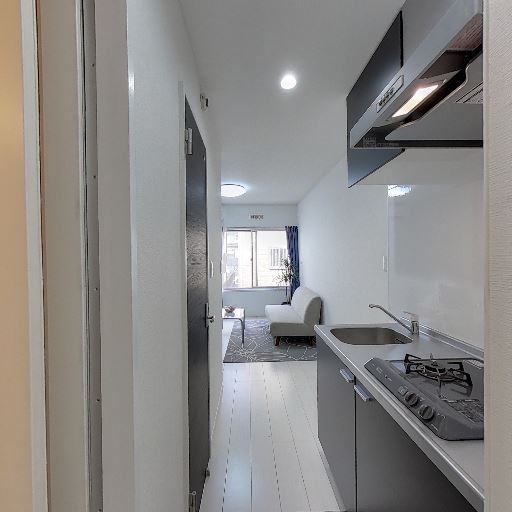 • キッチンと居室の導線(確度83%):細長い廊下型キッチンで、2口ガスコンロとシンクが並ぶ。奥に居室と窓が続き、一直線の動線。