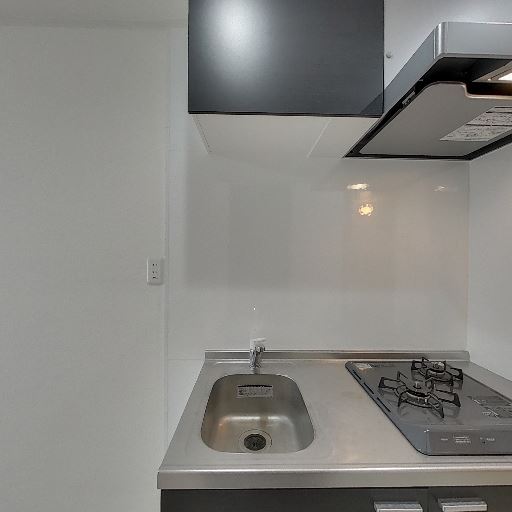 • 単身向けのコンパクトキッチン(確度86%):一口ガスコンロ2口と小さめのシンク、上部・下部収納が確認できる。作業スペースは狭め。