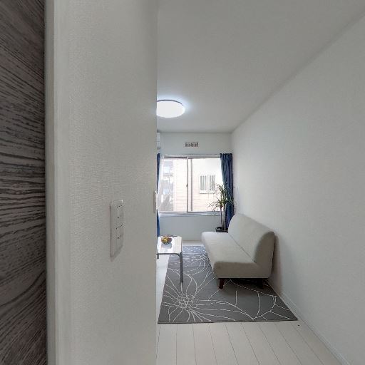 • リビングは明るめで家具配置イメージしやすい(確度78%):先の居室に窓があり、ソファやラグが配置されている。白基調の床と壁で光が回っている。