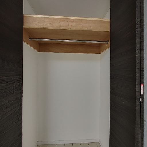 • クローゼット収納(確度90%):奥行きのあるクローゼットに上部棚とハンガーパイプがあり、衣類の吊り下げと小物の置き場が確保されている。