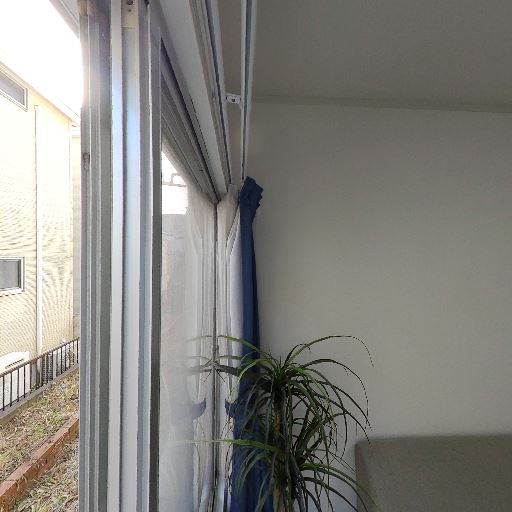 • 掃き出し窓とカーテンレール(確度78%):床までの掃き出し窓があり、二重のカーテンレールとレースが確認できる。通風・採光のコントロールがしやすい。
